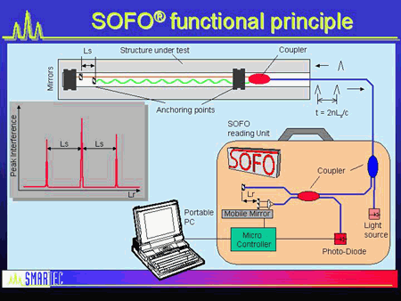 它基于與點(diǎn)光傳感器部分所述相同的白光干涉測(cè)量基本原理以上。來(lái)自白光源的光通過(guò)光纖傳輸?shù)焦鈱W(xué)傳感器。這里的傳感器由一個(gè)光纖耦合器組成,該光纖耦合器分成兩根不同長(zhǎng)度的光纖,每端都有一個(gè)微型鏡子。參考該配置作為Mach-Zehnder或傳感干涉儀。入射光脈沖由耦合器分成兩個(gè)脈沖,并且在返回時(shí),兩個(gè)脈沖在時(shí)間上分開t = 2nLs / c,其中n表示玻璃纖維的折射率,Ls 表示纖維的長(zhǎng)度差異和c光速。一根光纖連接到被測(cè)結(jié)構(gòu)上,而另一根光纖非常接近但沒有連接。結(jié)構(gòu)的變形導(dǎo)致路徑差2nLs 的變化。在這種情況下,它通過(guò)使用掃描移動(dòng)設(shè)備來(lái)測(cè)量