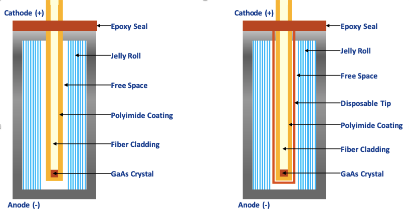光纖溫度傳感器可以在單元形成階段或之后安裝。與在制造的電池芯上安裝傳感器相比,在電池形成階段安裝傳感器很簡單。下面的圖1顯示了如何將光纖溫度傳感器安裝到圓柱形電池芯中的詳細(xì)視圖。